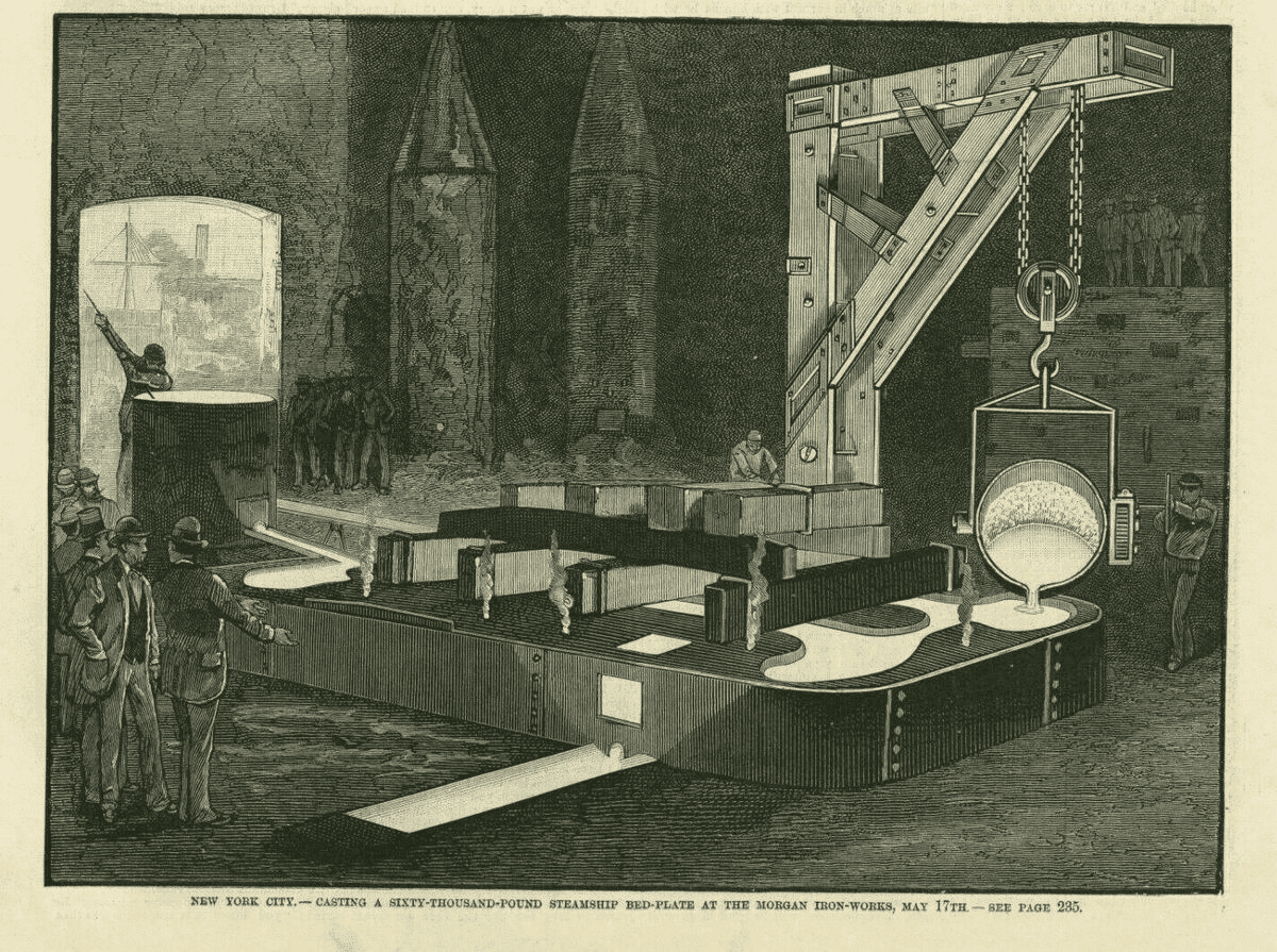 Morgan Iron Works was a leading U.S. manufacturer of marine steam engines. Originally established in 1838 as “TF Secor and Co.” by three partners – Charles Morgan, William K. Collyer (corrected from Kolkin for likely name), and Theodosius Fowler Secor – the plant was located on East 9th Street in Manhattan. Initially, the newly formed works employed about seven hundred workers, building engines for coastal and ocean-going steamships. Soon, due to the high demand for steamships, the plant underwent expansion. In 1850, Charles Morgan bought out his co-owners’ shares and renamed the company Morgan Iron Works.