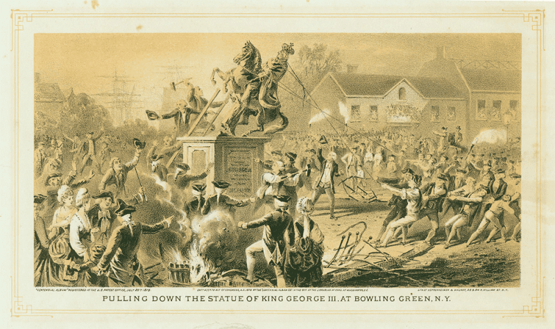 Боулинг-Грин, с его торжественной историей, также был свидетелем присутствия статуи, изображавшей короля Георга III — памятник стал эмблемой, которая символизировала репрессивную мощь британского режима, господствовавшего на американских землях. Эта история начинается жарким июлем 1776-го года, когда Джордж Вашингтон со всей пылкой эмоциональностью зачитал содержание только что разработанной им Декларации независимости своим подданным войскам в Сити Холл-парке.