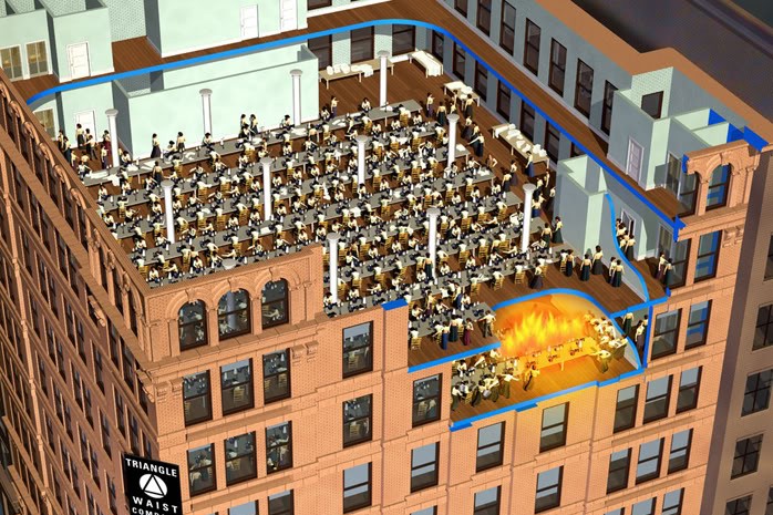 Бухгалтер на 8-м этаже смог предупредить работников 10-го этажа по телефону, но не было звуковой сигнализации и возможности связаться с персоналом на 9-м этаже. Тогда существовало четыре лифта с доступом к фабричным цехам, но только один из них был полностью функциональным, и рабочим приходилось идти по длинному узкому коридору, чтобы добраться до него. Также насчитывалось две лестничные клетки, ведущие вниз на улицу, но одни двери были заперты снаружи, а другие открывались только внутрь. Это распространенная практика того времени: таким образом работодатели пытались предотвратить несанкционированные перерывы и уменьшить количество краж среди персонала. Двери, которые открывались только внутрь, были заблокированы из-за напуганной толпы, которая скопилась у выхода, пытаясь в панике прорваться наружу.