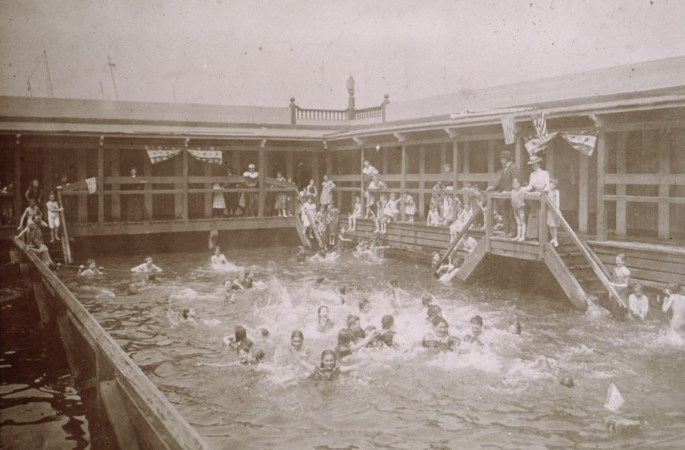 Влітку 1870 року в Нью-Йорку з’явилася перша муніципальна купальня, що становила собою басейн, занурений у річку, через який текла річкова вода. У статті New York Times за 1871 рік її описали. Таким чином, відомо, що вона мала звичайну форму, схожу на будинок, і площа для плавання становила 85 футів у довжину і 65 футів у ширину. Купальню оснастили 68 роздягальнями, також вона мала офіси та кімнати на додатковому поверсі, які освітлювалися газовими лампами для повноцінного купання вночі. Через рік після її будівництва Департамент громадських робіт повідомляв, що купальня була переповнена особливо в спекотні літні дні.